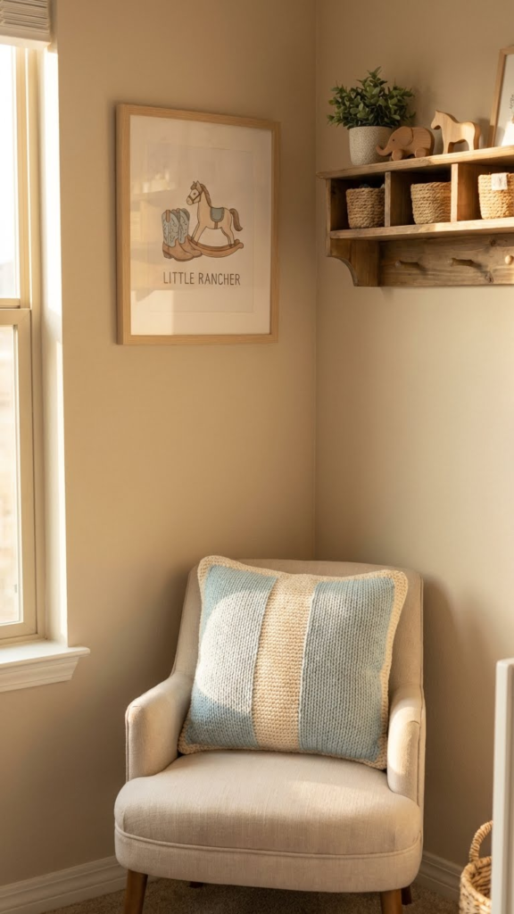 Small details like a sheriff star print or rope-style storage hint at the western theme without making the room feel overly themed.