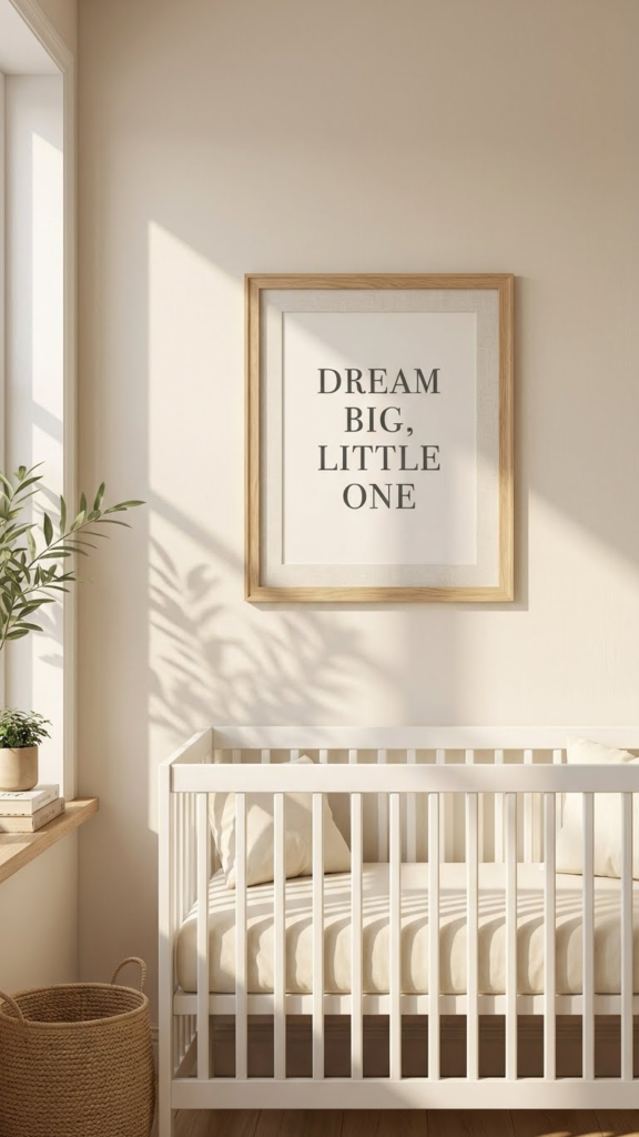 Quotes like “To Infinity and Beyond” or “You’ve Got a Friend in Me” add emotional warmth to a nursery. Choose simple fonts or wooden signs instead of cartoon lettering.