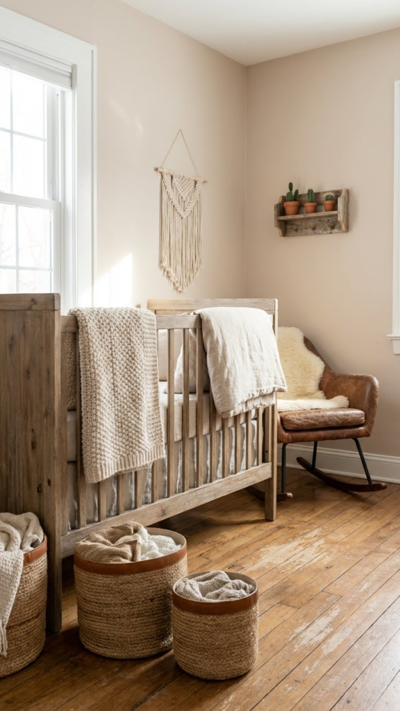 Woody brings warmth and comfort to a nursery. Natural wood furniture, woven baskets, and soft beige accents help create a grounded, cozy feel.