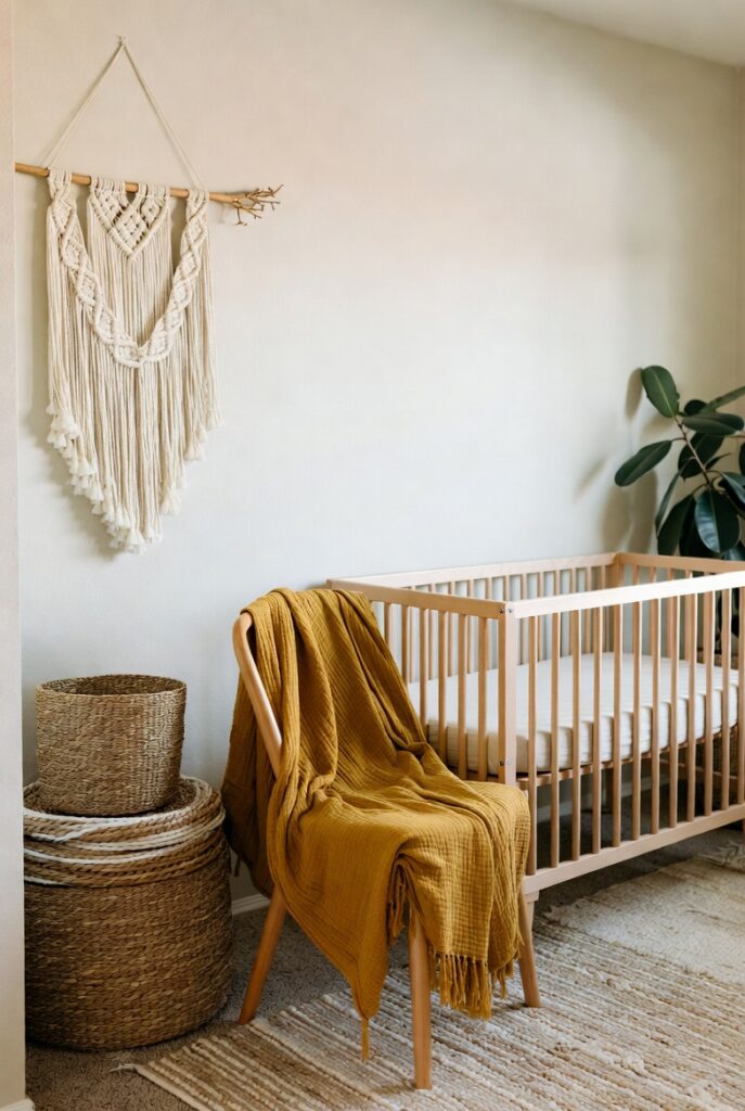 Boho nurseries feel relaxed and lived-in. Yellow works beautifully here through macramé wall hangings, woven baskets, and soft textiles. I love mustard or warm golden tones for this style. Add plants (real or faux), natural wood, and layered textures. The result feels cozy, creative, and very Pinterest-worthy.