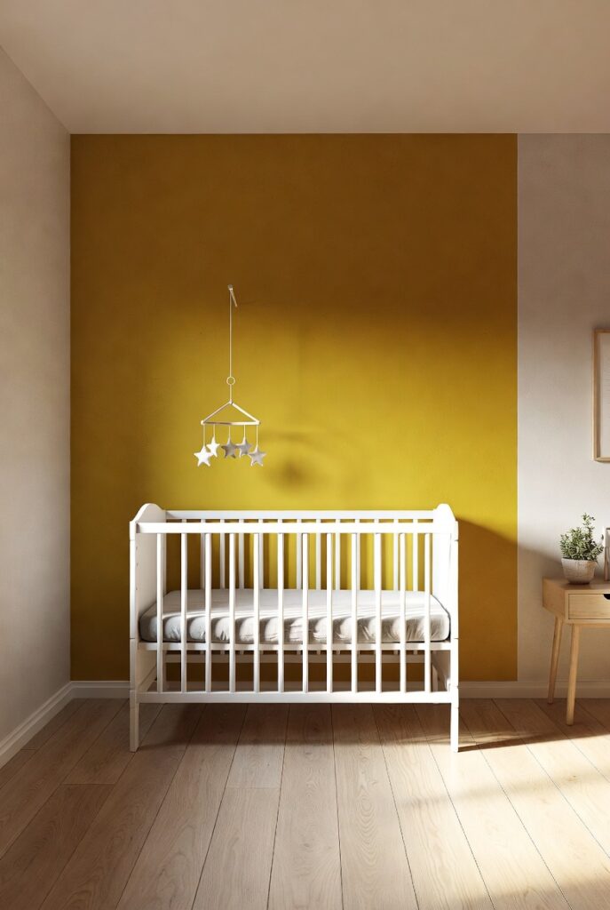 A single mustard yellow wall can add depth without overwhelming the space. It works best behind the crib or reading nook. Balance it with white or beige everywhere else. Mustard feels richer and more grown-up than bright yellow, making it perfect if you want a nursery that ages well.