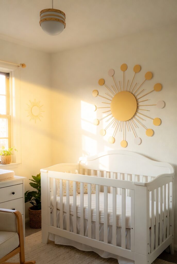 A sun-themed nursery is cheerful without being loud. Use soft yellow suns in wall decals, artwork, or mobiles. Keep the rest of the palette neutral so the theme doesn’t feel cartoonish. This idea works especially well in rooms with natural light. It feels happy—even on rough nights.