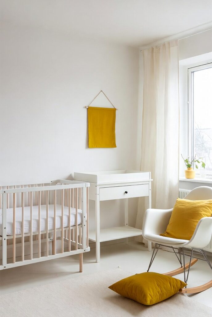 If clutter stresses you out, this one’s for you. A white base with yellow accents feels clean and peaceful. Think white walls, white crib, then add yellow through pillows, wall art, or a cozy throw. This setup keeps the room bright without feeling busy. It’s also budget-friendly since you can swap accents easily as your style changes.